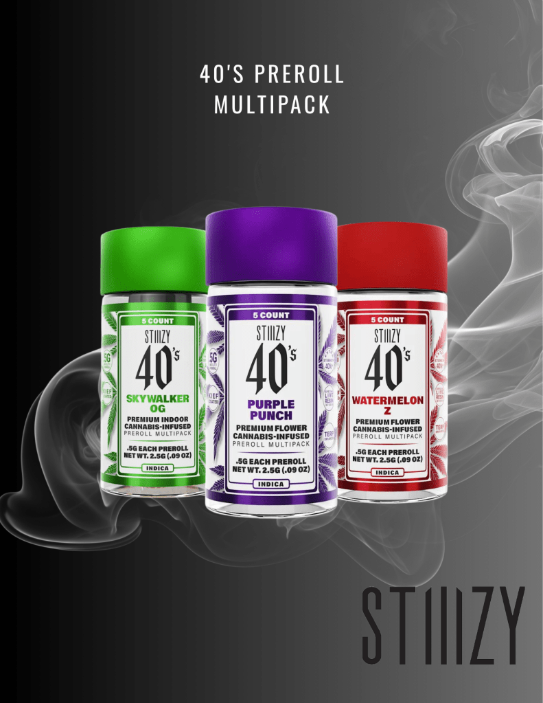 Elevate your preroll game with STIIIZY 40’s infused prerolls — a bold fusion of potency, flavor, and craftsmanship. Each preroll starts with 0.5 grams of premium cannabis flower, infused with expertly extracted live resin, then finished in a kief-coated cone for maximum impact.